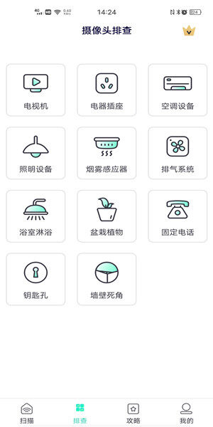 在排查界面中,你可以在这里使用逐步排查功能快速找出摄像头,针眼查会提供图文排查方法,但检测功能需要开通会员方可使用。在攻略界面中,你可以这里通过图文防护攻略和视频攻略学习出门在外防止被偷拍的知识。在我的界面中,你可以在这里查看历史检测记录。