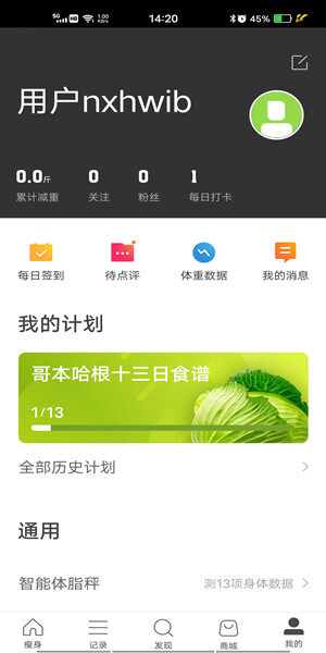 在我的界面中,可以查看体重数据、累计减重、我的计划等信息。